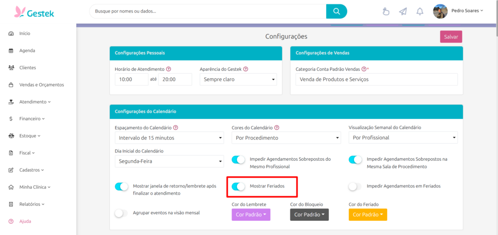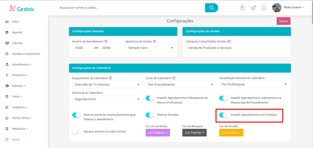 Marque “Impedir Agendamentos em Feriados” para bloquear a agenda em feriados