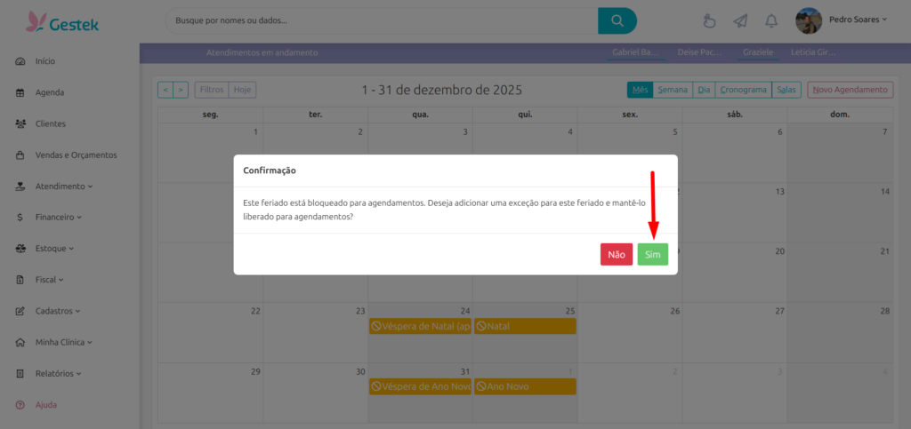 Confirme a ação: Este feriado está bloqueado para agendamentos. Deseja adicionar uma exceção para este feriado e mantê-lo liberado para agendamentos?