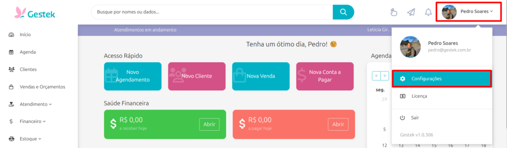 Acesse o menu superior direito, onde mostra seu nome, clique em Configurações.