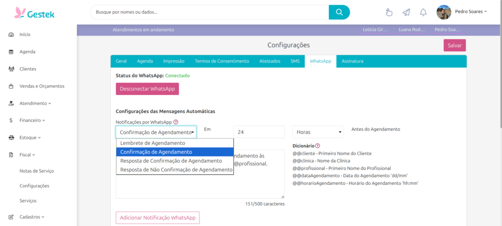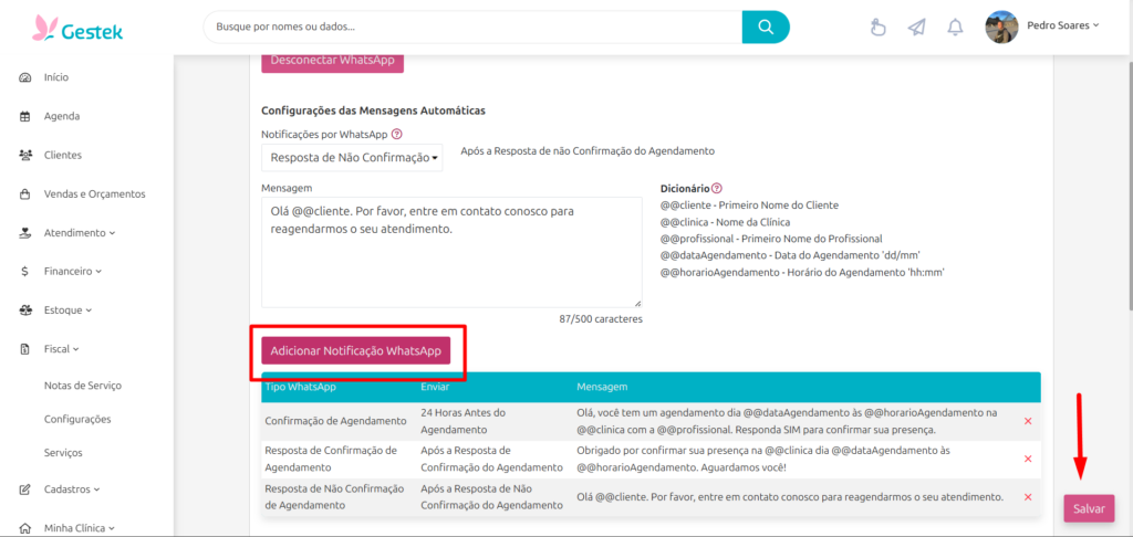 Clique em Adicionar Notificação WhatsApp para fixar cada modelo programado e, ao final, clique em Salvar.